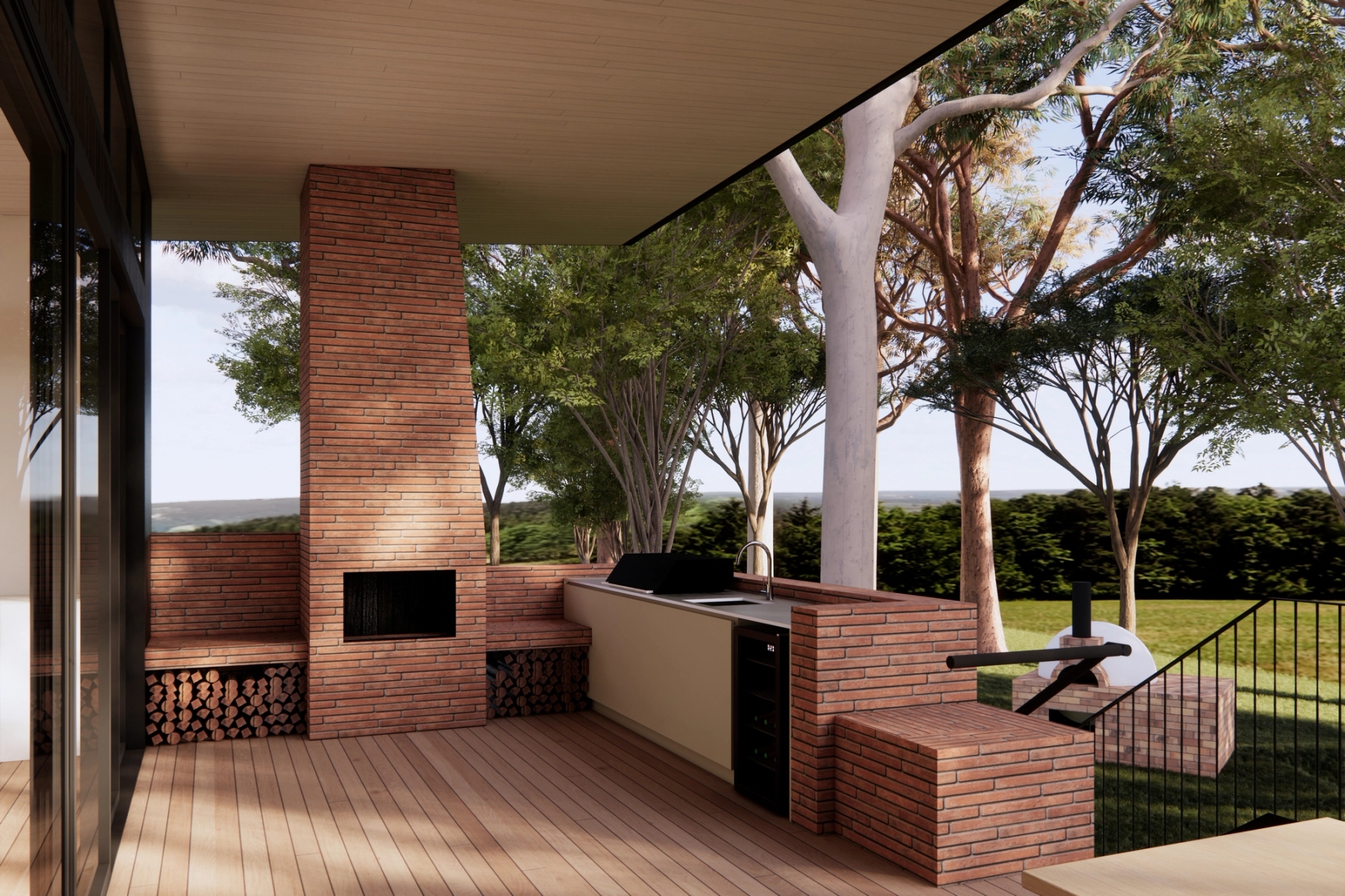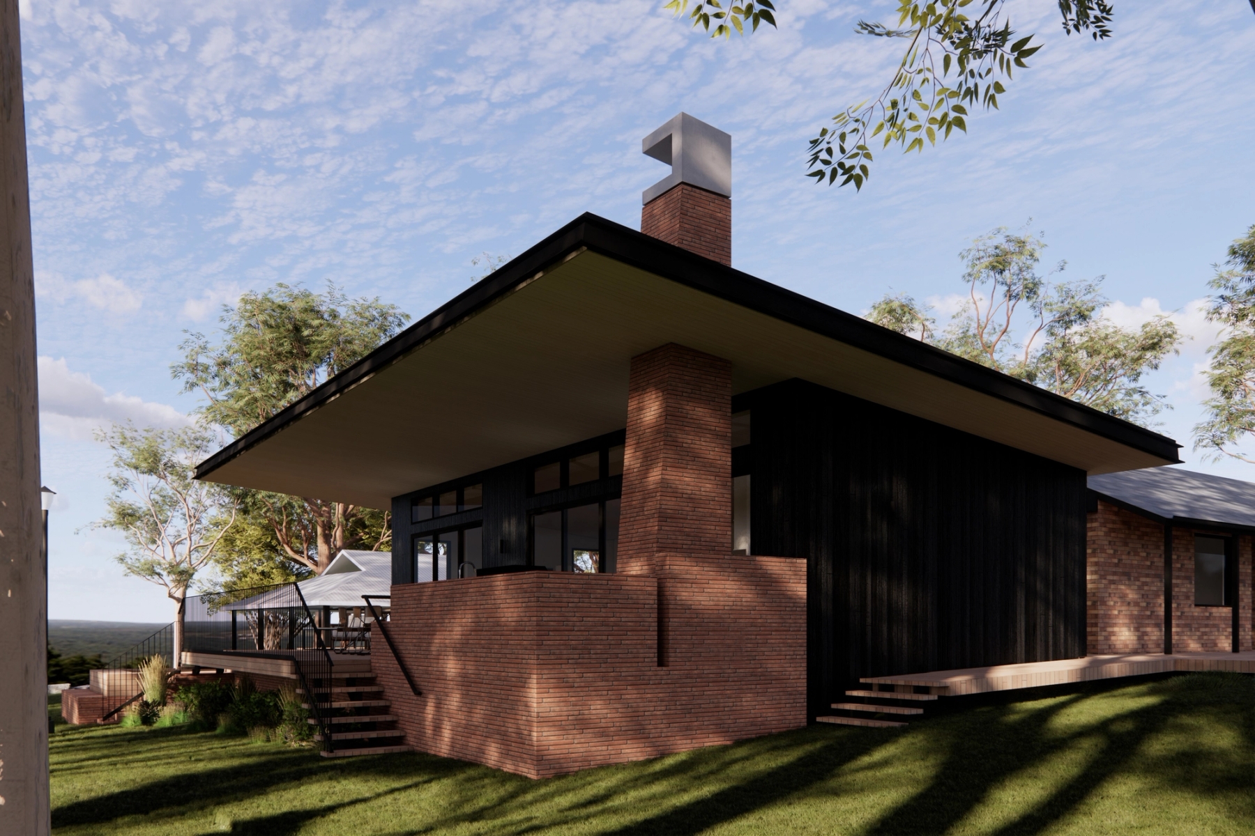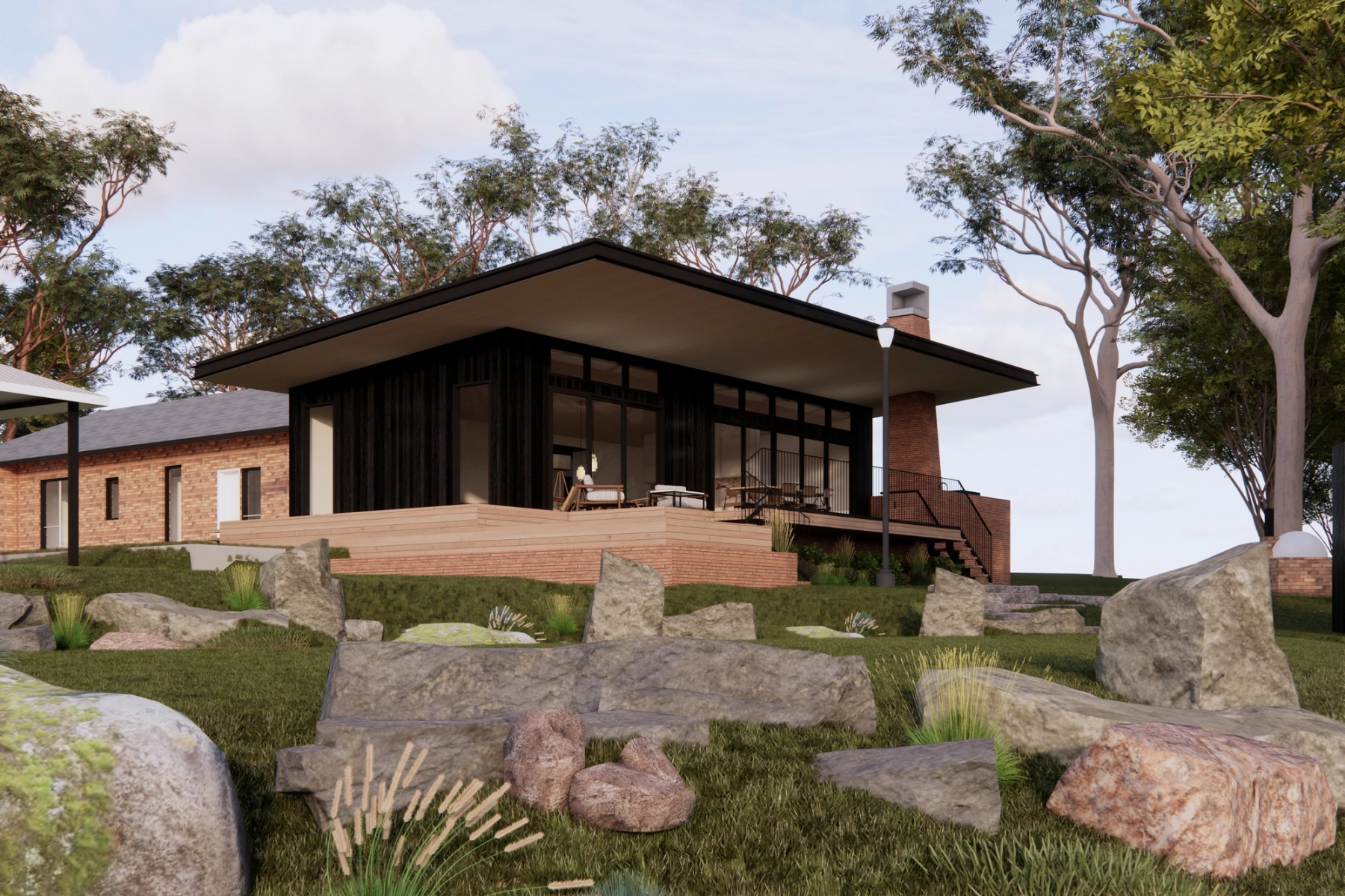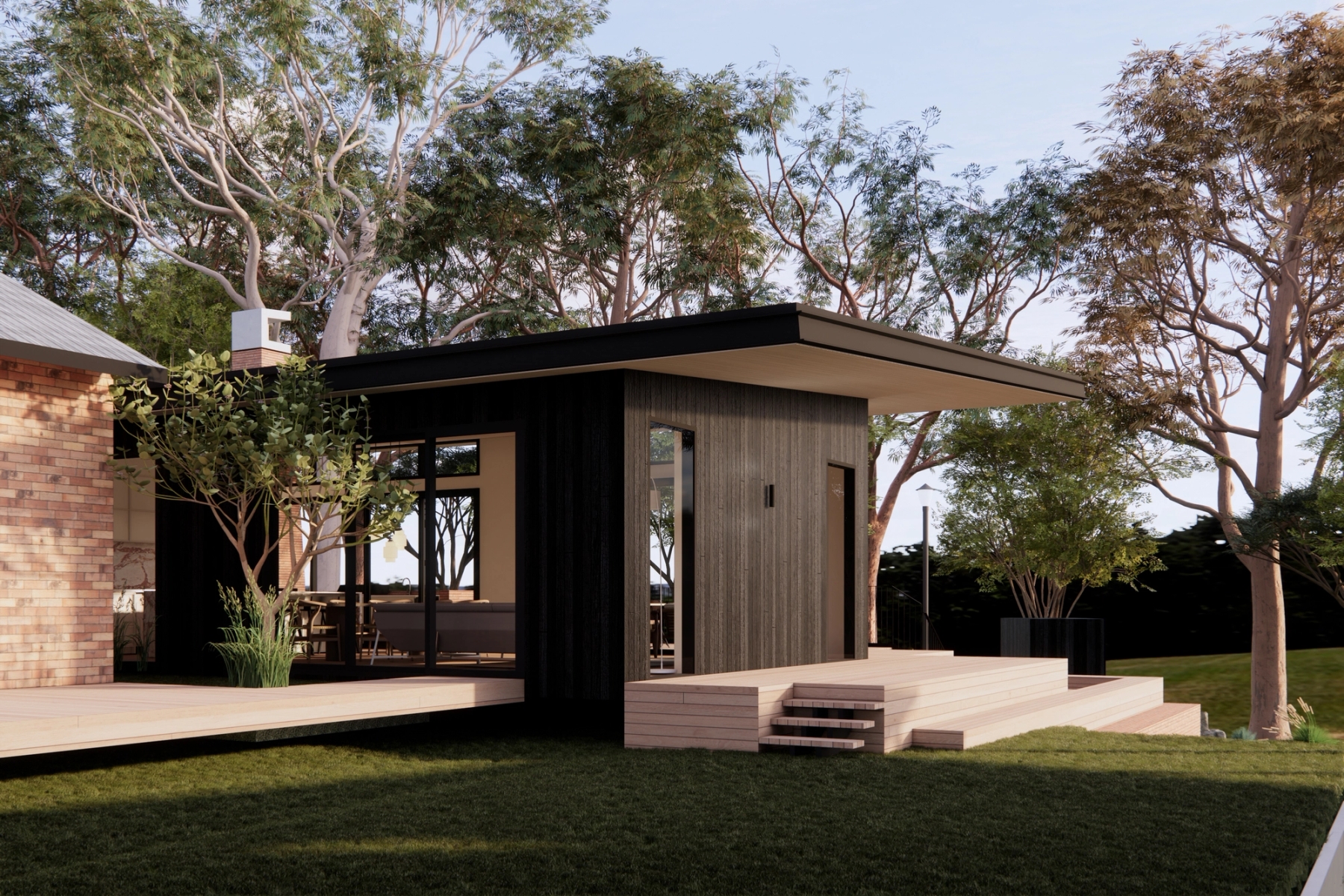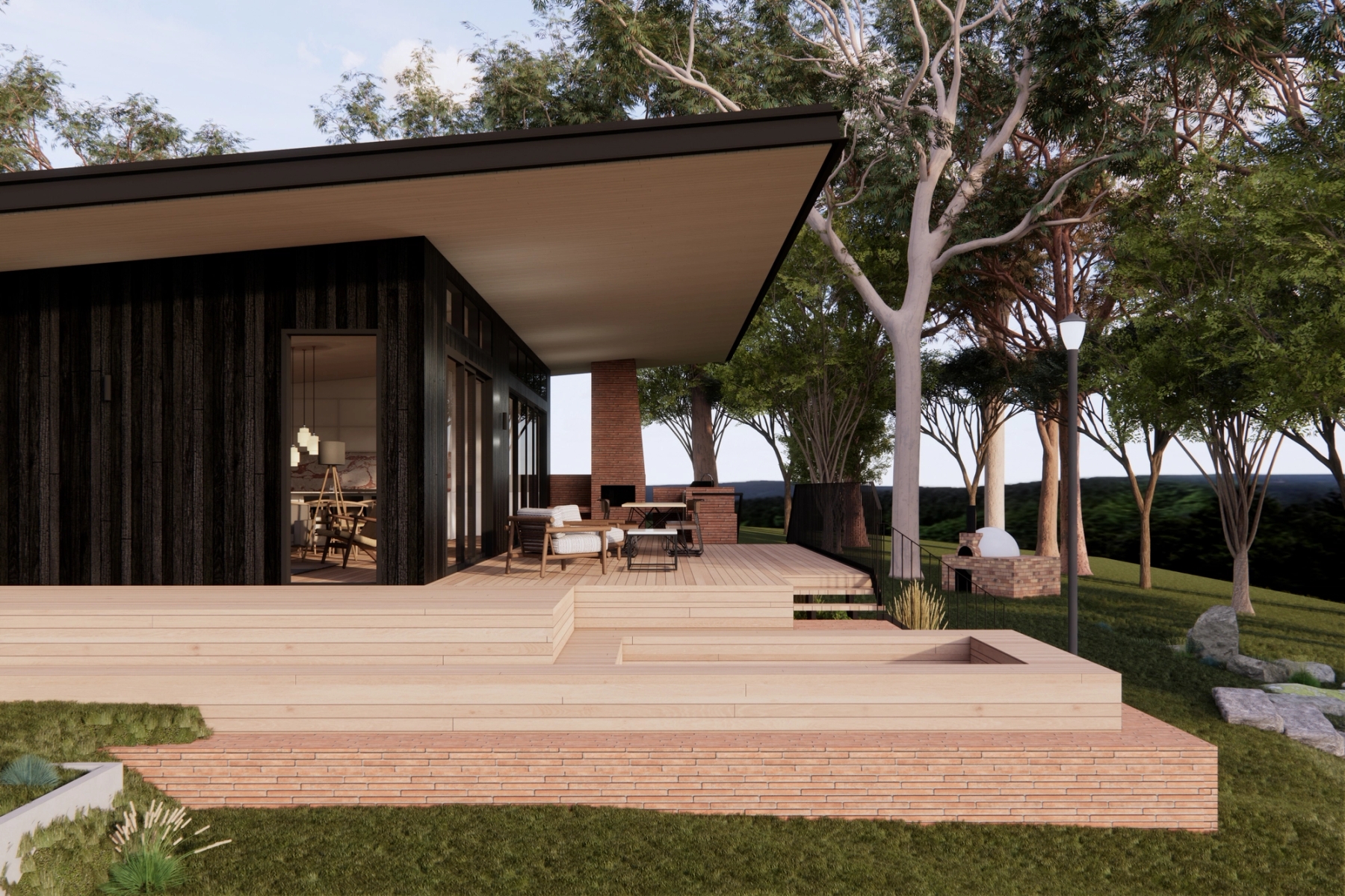 The views of the adjoining forest and mountain ranges are amplified by the raking ceiling and tall glazing. The deck connects to the existing landscaping through platforms which provide spaces to relax and enjoy the sunset.