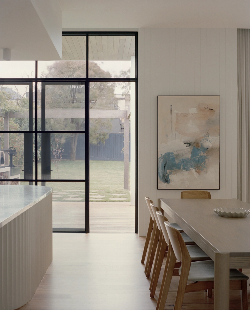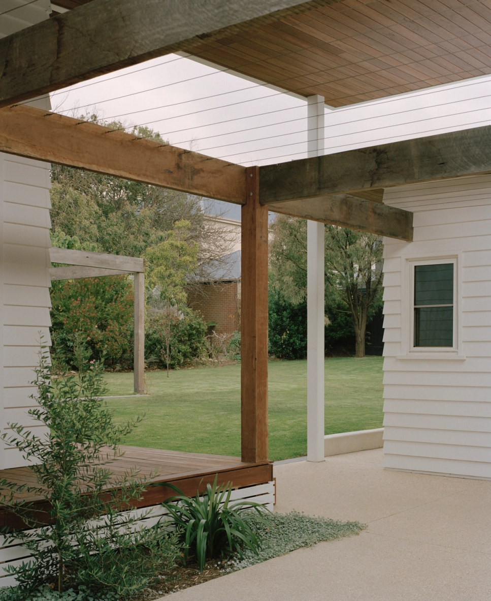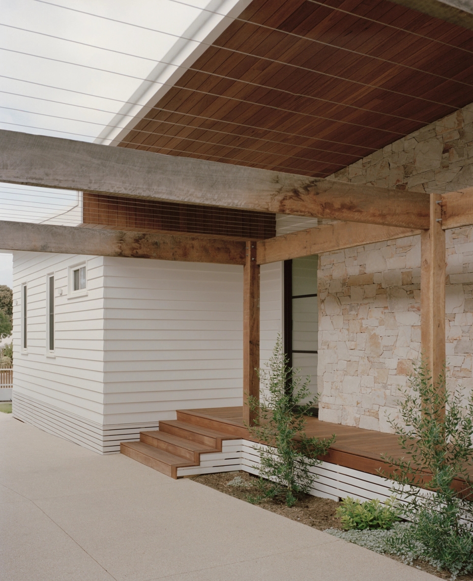 A 5 minute walk from Torquay’s front and back beach, local coffee shops and restaurants and with a north facing rear, this is truly the ideal location for an authentic Torquay beach house. A significant renovation and extension, it was a priority for the owner that front facade kept the character of the traditional Torquay beach shack. However, when you walk through the property, the extension reveals a raked roof opening towards the north, with the house pushed to the edge of the site to maximise the backyard.