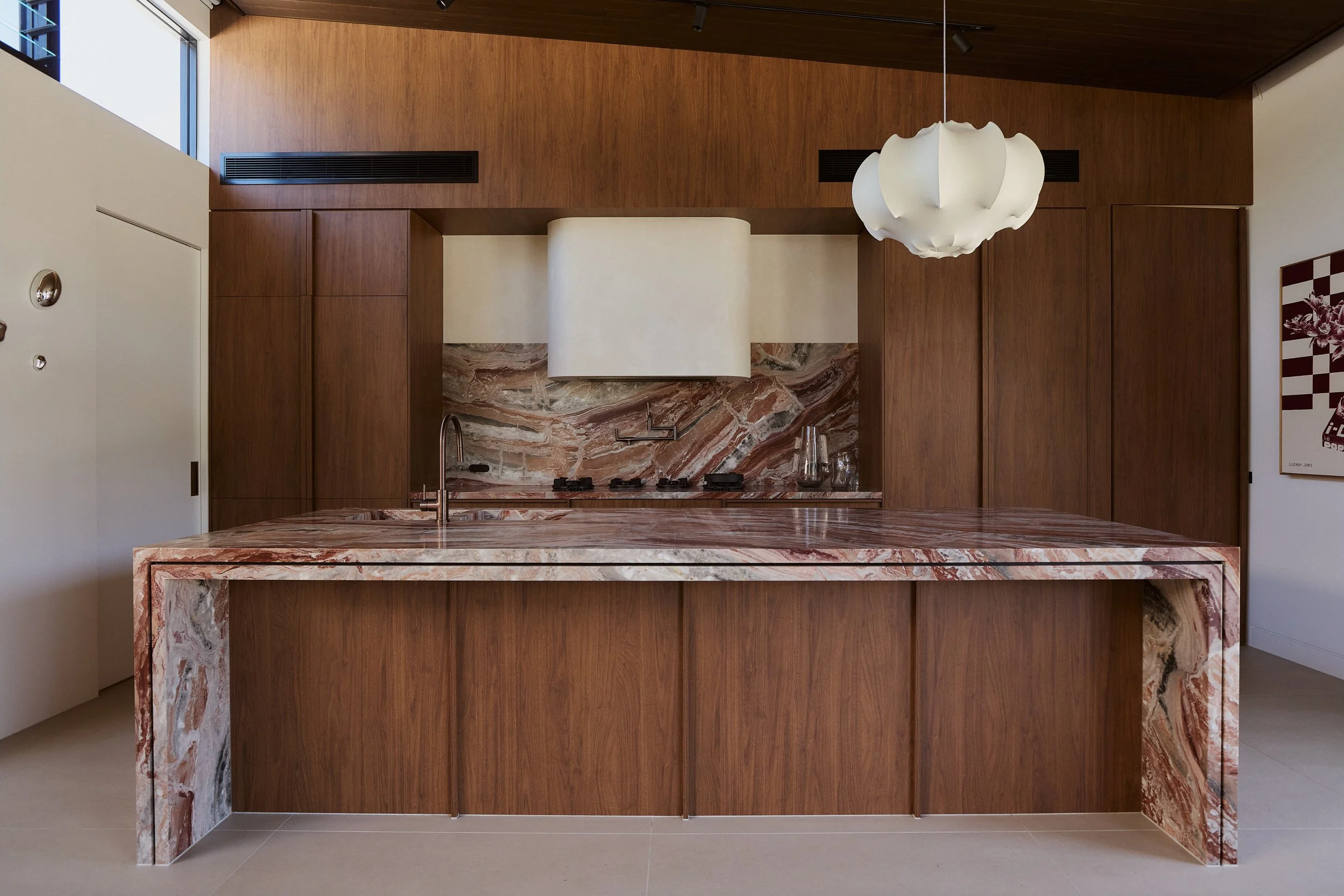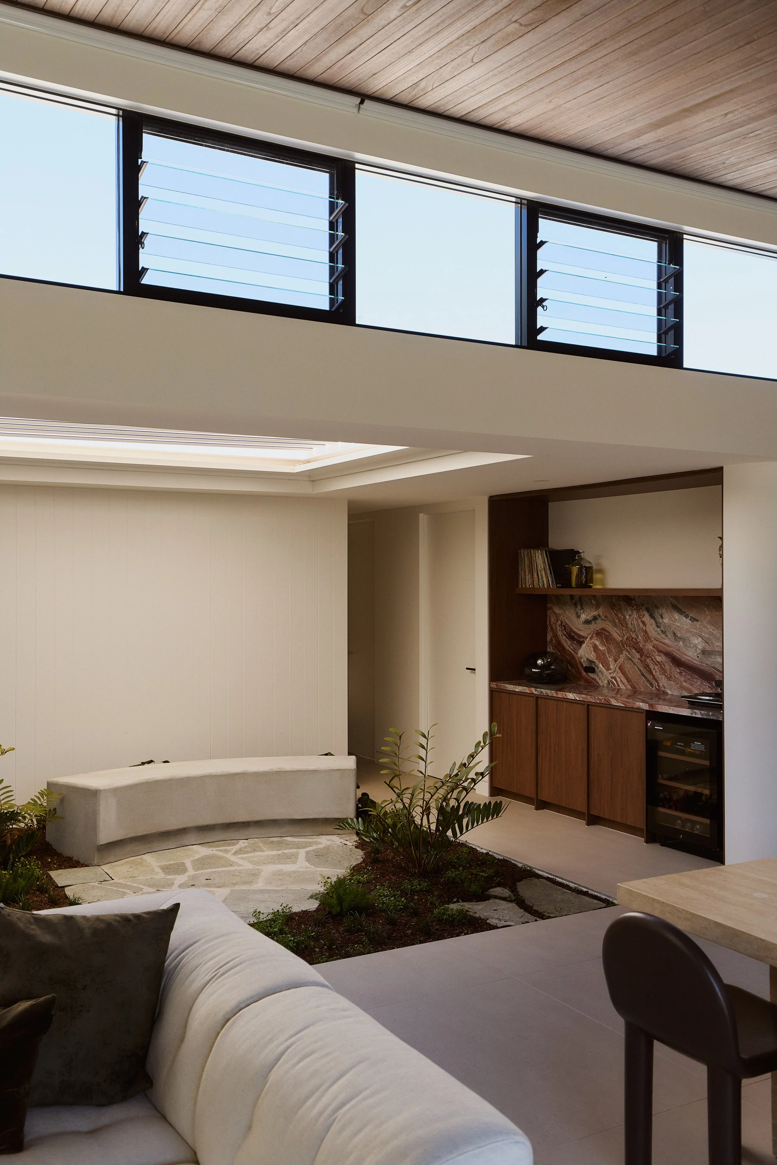 A significant renovation to an existing mid-century beach shack on the Gold Coast in Queensland. By creating a new living / kitchen / dining zone, with a generous raked ceiling, it allows for a new bay of north facing high level windows to turn a previously dark living zone to a light filled mid-century modern oasis.